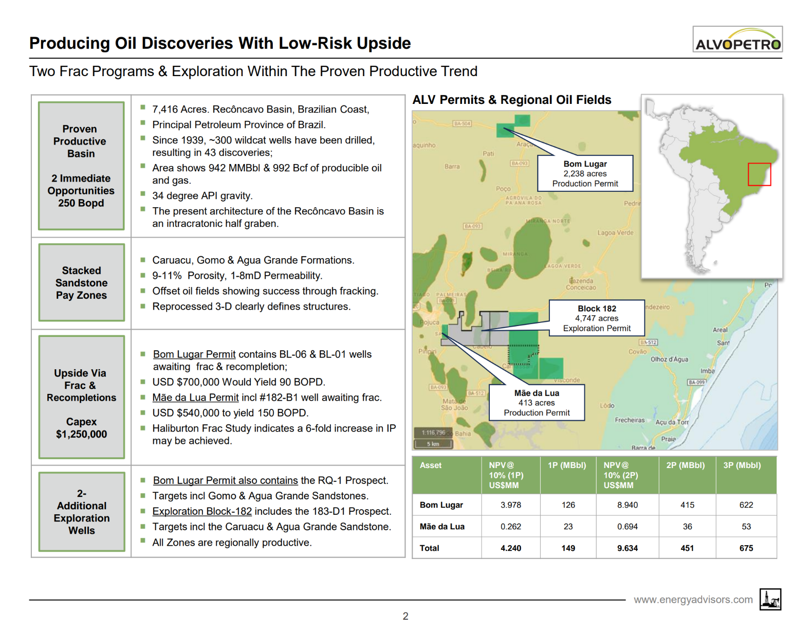 Alvopetro is offering three PDP wells that have produced 360 MBO and are currently producing 14 BOPD. There are a number of new drilling opportunities including PUD and exploration locations. Alvopetro envisions a new owner acquiring these assets, with plans to complete two new fracs and a third workover which could increase production to 250+ BOPD.