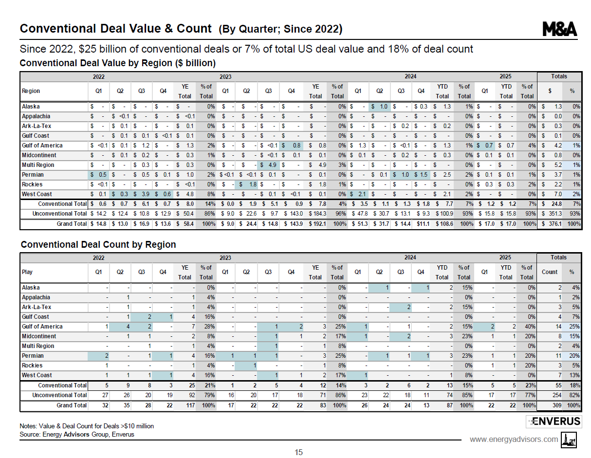 - Since 2022, conventional deals represent ~7% of U.S. A&D market or an average of $1.9 billion per quarter;