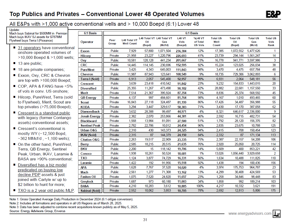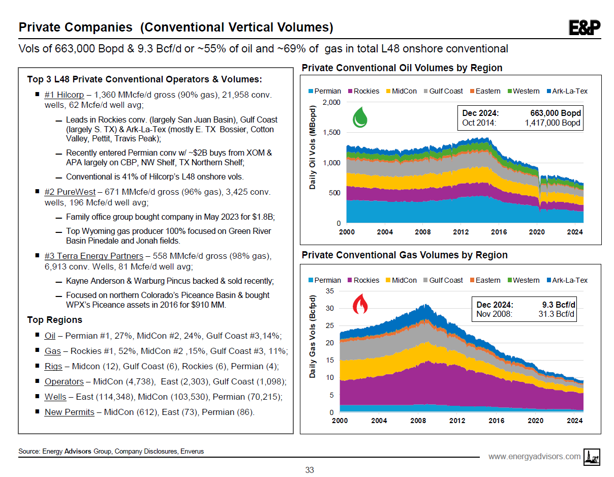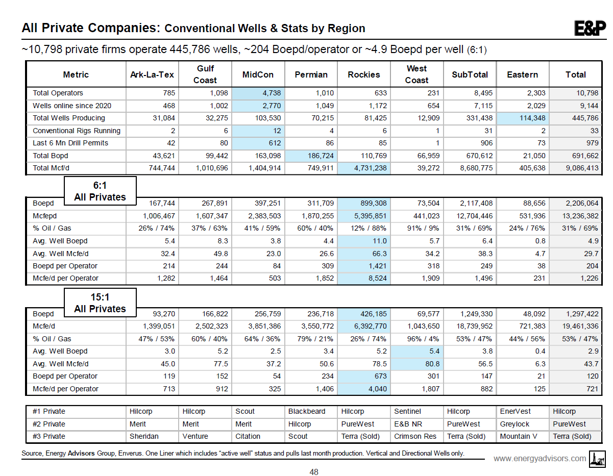 -------Privates. “Out of ~11,000 private operators with conventional production onshore, ~1,500 produce daily volumes >100 Boepd. Hilcorp leads. The Rockies is home to the next two largest conventional operators, PureWest and Terra I (which was recently sold to Flywheel)."