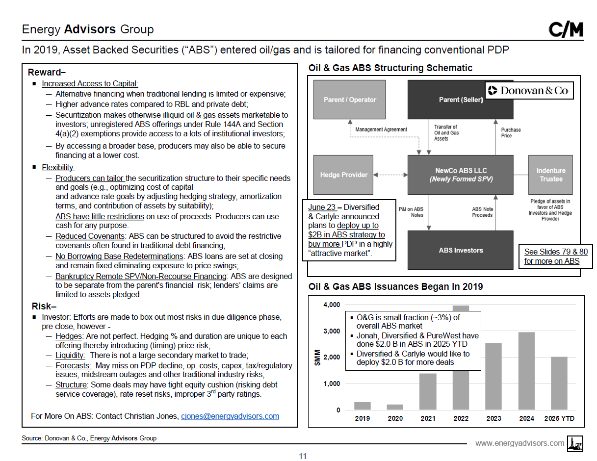 -------ABS. “Conventional PDP is tailor made for ABS. Key criteria include lots of wells, low decline rate and ability to hedge – all designed to reduce concentration and price risk. Operators can use proceeds for any purposes."