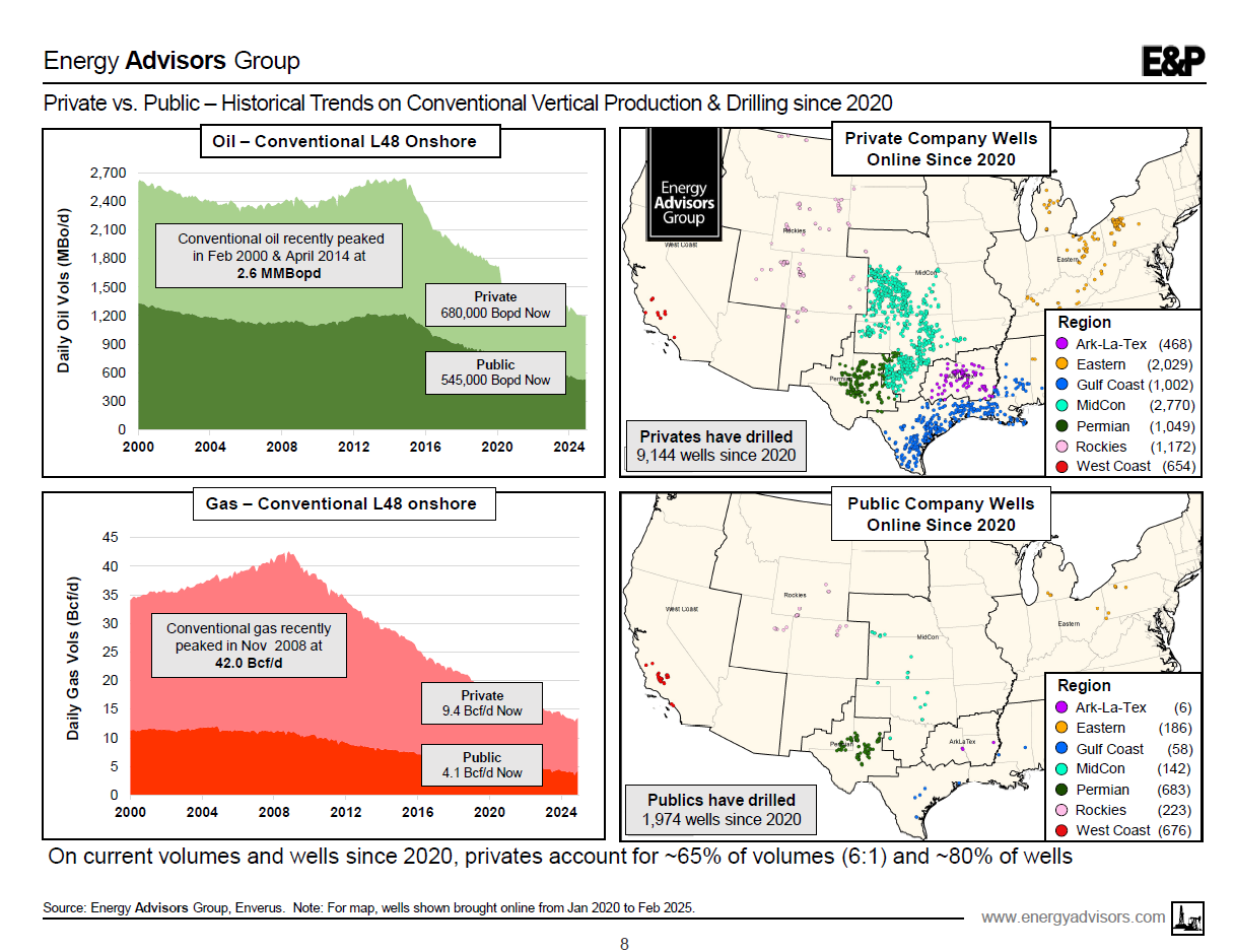 - Private companies have drilled ~80% of new conventional wells since 2020;