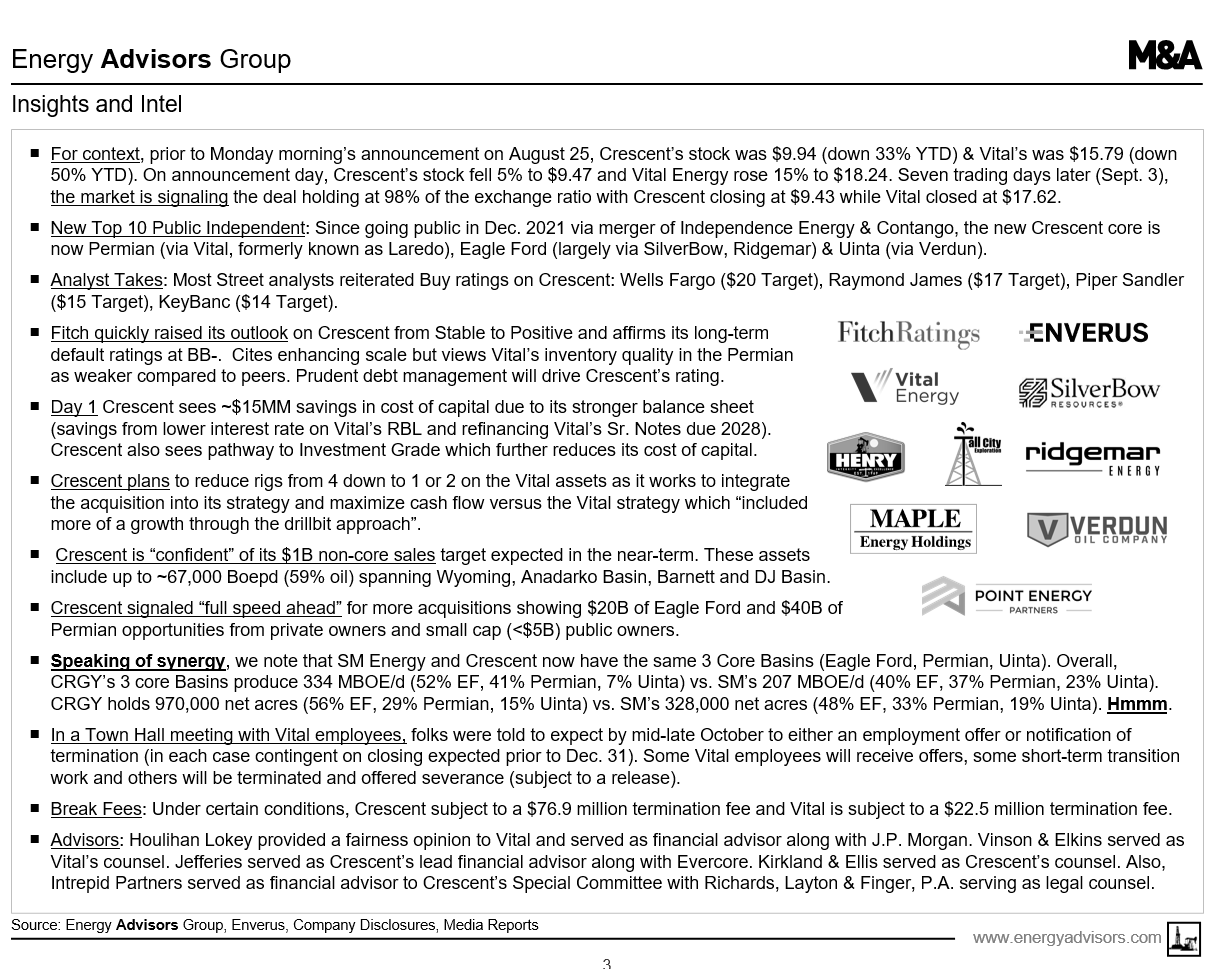 Energy Advisors Group (EAG) has issued a Deal Alert, analyzing Crescent Energy's deal to buy Vital Energy (formerly known as Laredo Petroleum) that adds Permian as a third core area in addition to the Eagle Ford and Uinta. The 9-page report is a continuation of our Market Monitor series and thought leadership efforts.