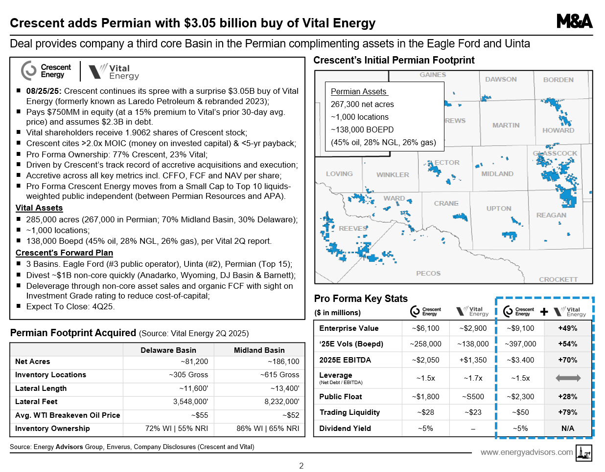 Crescent has successfully deployed a growth through acquisition strategy and is dedicated to maximizing cash flow. Consistent with that strategy, Crescent will be reducing Vital's 4-rig program in the Permian down to 1 or 2 rigs as it seeks to use cash flow to reduce debt, maintain shareholder payouts and strive for an Investment Grade rating as another tool to create value and reduce cost of capital.