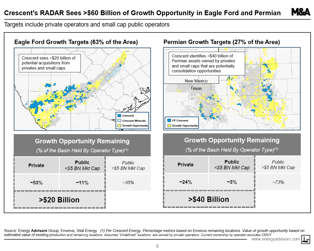 Crescent also unveiled >$60 billion of growth opportunities in the Permian and Eagle Ford. The targets are screened for private operators and small cap publics who cover ~27% of the Midland and Delaware Basins and ~64% of the Eagle Ford play.