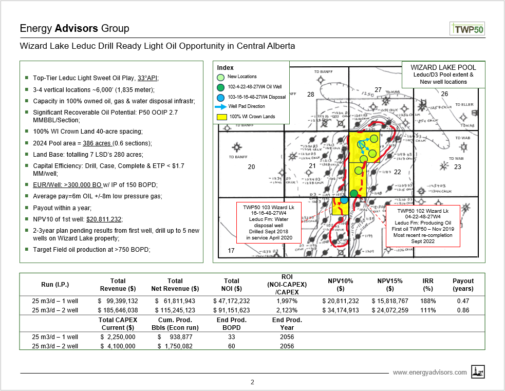 For investors, the wells drilled and tied-in will earn a Working Interest in the Wizard Lake Leduc Rights in potentially all currently undrilled TWP50 lands. Included will be the 3rd party fee-based access to the TWP50 facility.