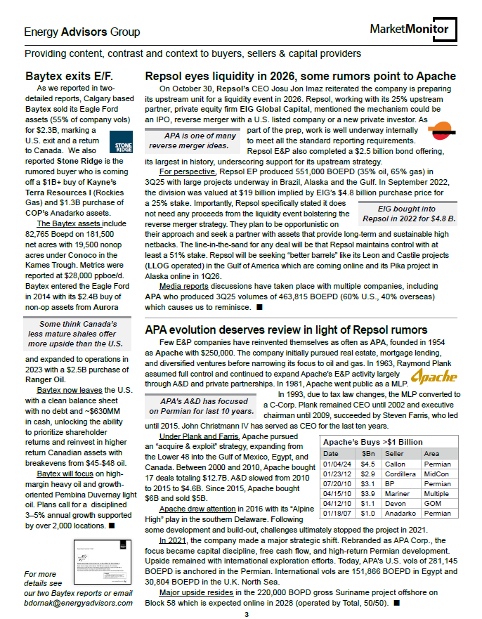 - Repsol is preparing a liquidity event for its E&P arm in 2026. One option is a reverse merger with a U.S. independent. APA Corp is mentioned as a possibility.