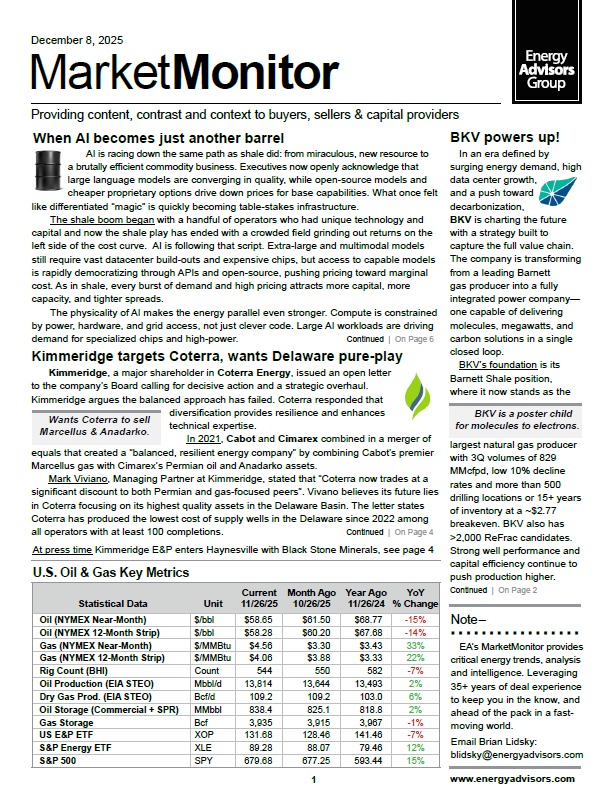 Page 1 "AI Just Another Barrel?", "Kimmeridge Targets Coterra", "BKV Powers Up" -----