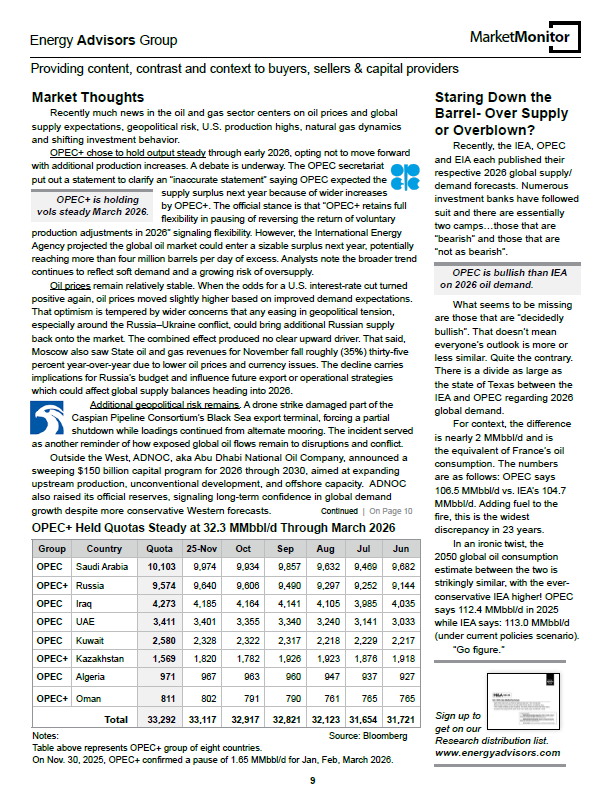 - OPEC+ pauses hikes through March 2026. OPEC more bullish than IEA on 2026 demand.