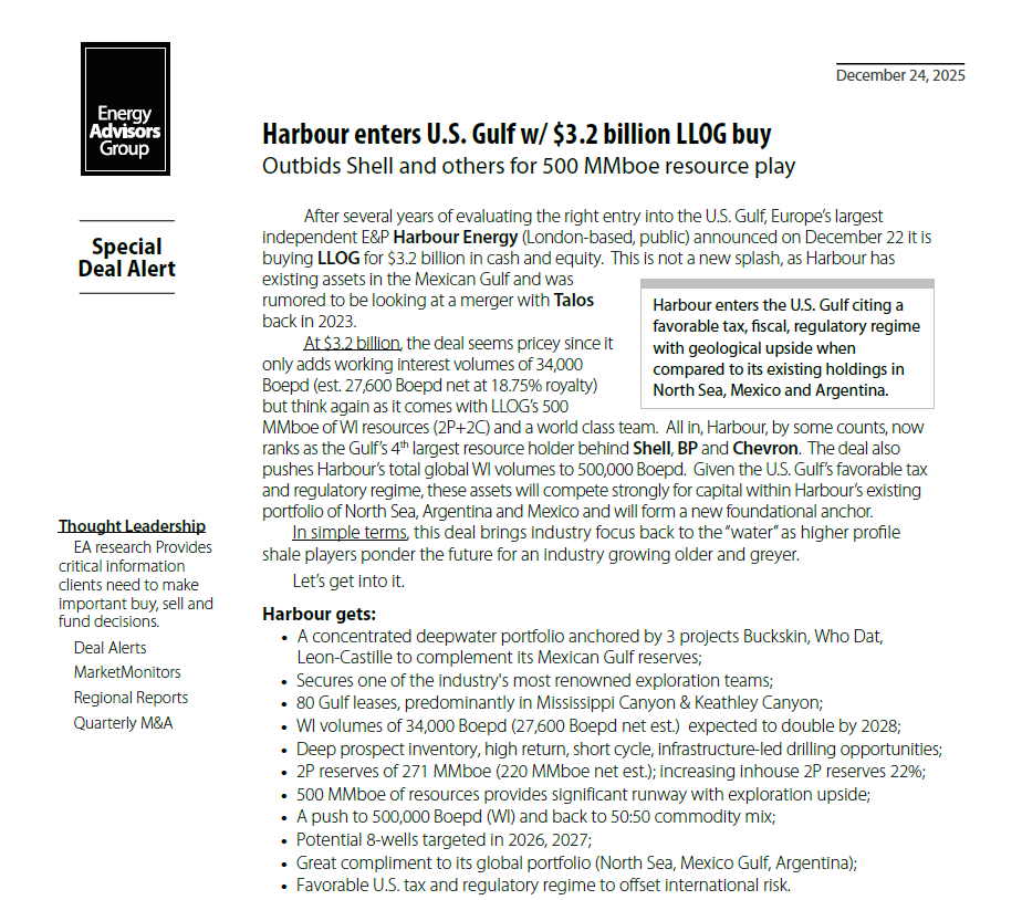 Energy Advisors Group (EAG) has issued a Deal Alert, analyzing Harbour Energy, Europe's largest independent, deal to enter the U.S. Gulf of Mexico with a buy of LLOG Exploration. After years of seeking the right entry, Harbour worked hard to meet LLOG's priorities and remarked that the deal was more than just price. Earlier reports had Shell in advanced talks for the deal.
