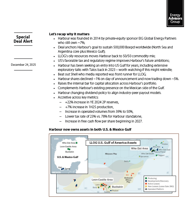 ------- Why it Matters: “The deal is significant. It immediately provides Harbour with the largest resources base in the U.S. Gulf among independents and ahead of OXY, Talos, Beacon, Murphy and Woodside."