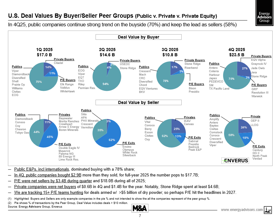 ------- How was 2025? "Publicly reported transactions slowed to $66B, down from $108B in 2024. Deal counts however increased to 95 from 84 in 2024. Public E&P consolidation continued with SM taking Civitas ($7.7B, Nov), Viper buying Sitio ($4.1B,June), Crescent getting Vital ($3.0B, Aug) and CRC buying Berry ($0.7B, Sept)."