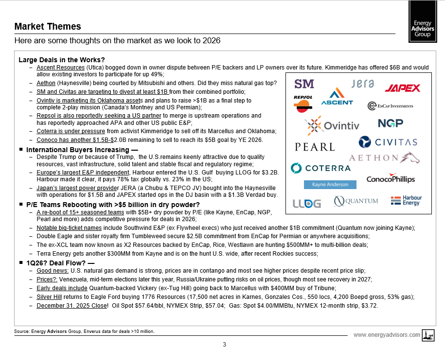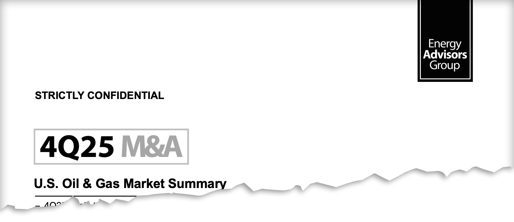 Energy Advisors Group has released a 4Q 2025 Special Report on the U.S. A&D marketplace as a continuation of our Market Monitor Series and thought leadership efforts. The full 28-page Special Report provides perspectives on the outlook plus past and current trends in deal values, counts, plays and valuations.
