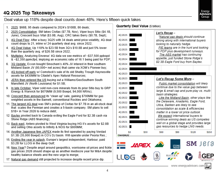 ------- Natural Gas Gaining Momentum. Pure-play gas deals were 28% of transactions in 4Q25 compared ~11% historically. Four of the top 10 deals are natural gas, including Marcellus, Haynesville and Barnett.