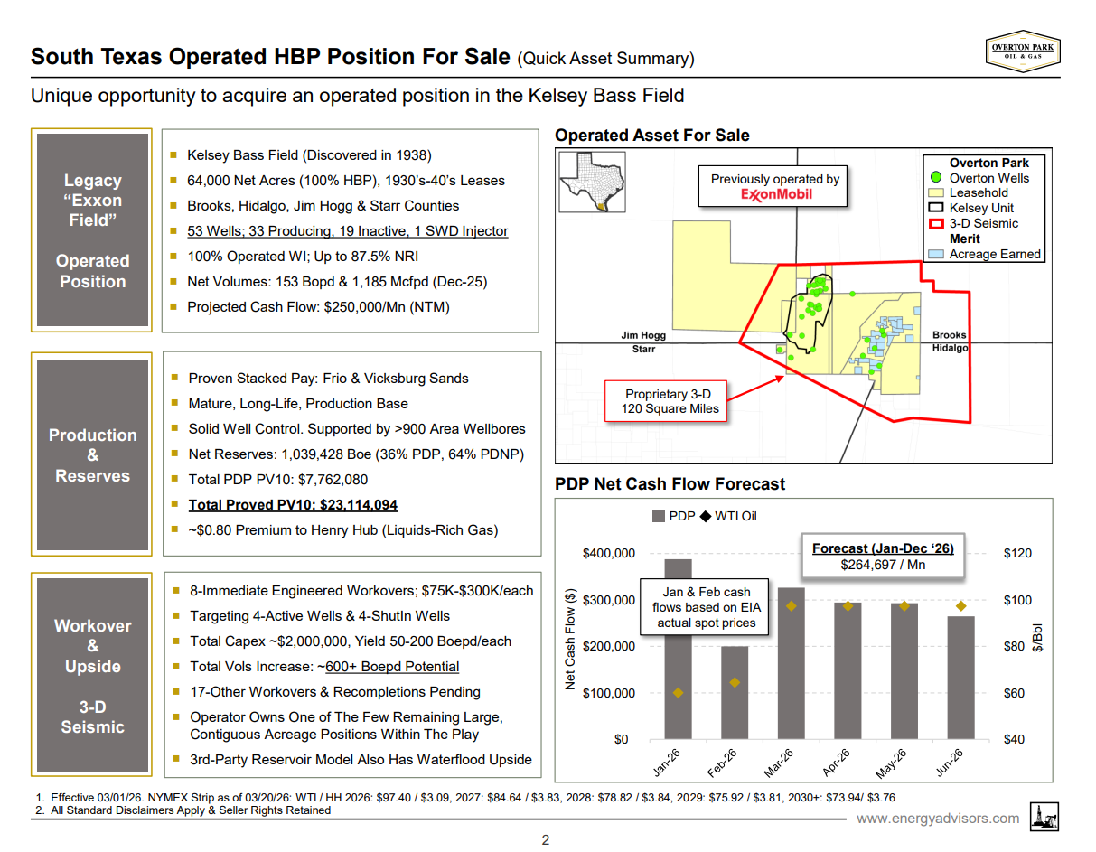 Energy Advisors Group has been retained by Overton Park Oil & Gas to market the Kelsey Bass conventional field opportunity. The assets are located primarily in Brooks, Hidalgo, Jim Hogg and Starr Counties, Texas, within the well established Kelsey field along the Gulf Coast.