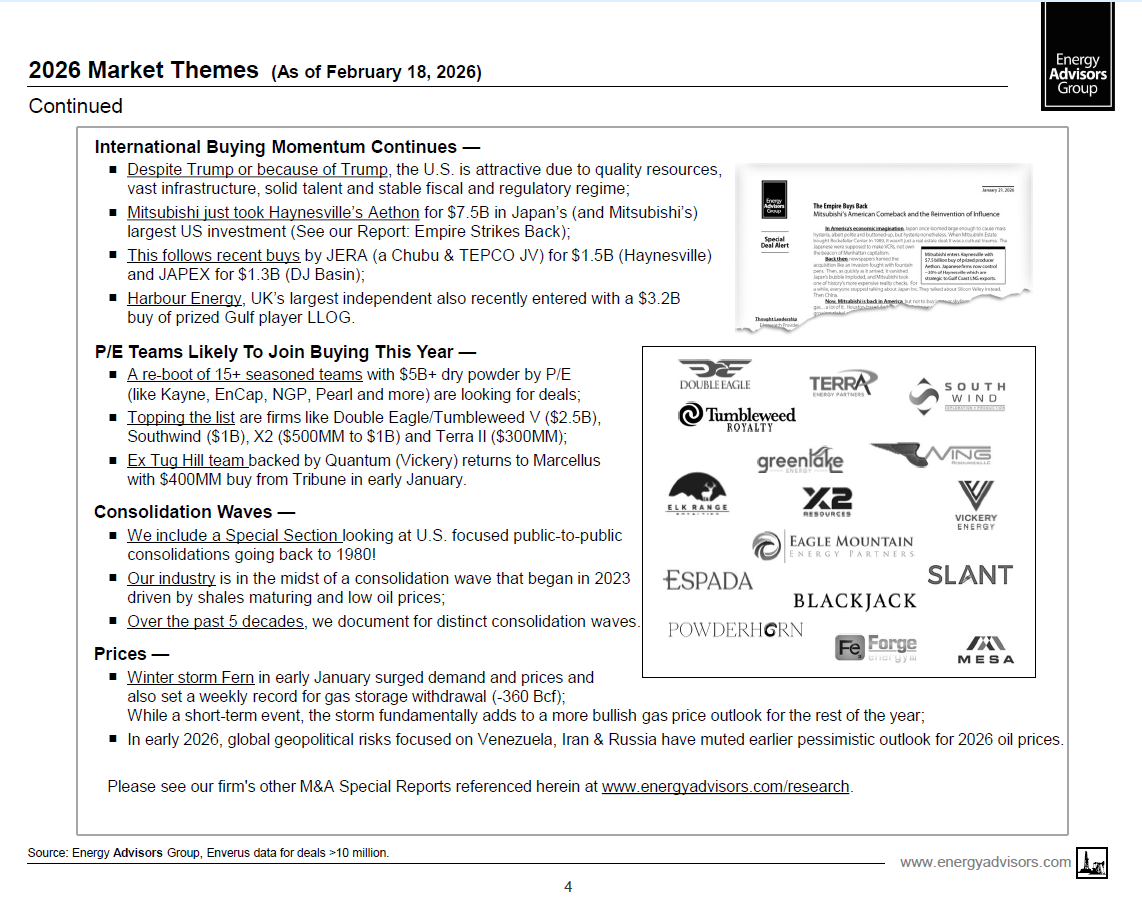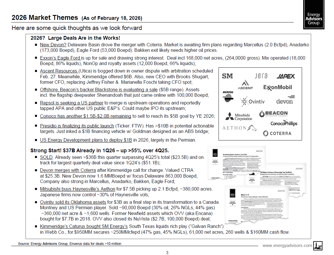 ------- 2026 Is Off To A Strong Start. Through February 18, there's been $37B in deals, up >55% over all of 4Q2025 led by Devon's merger with Coterra ($25.3B).