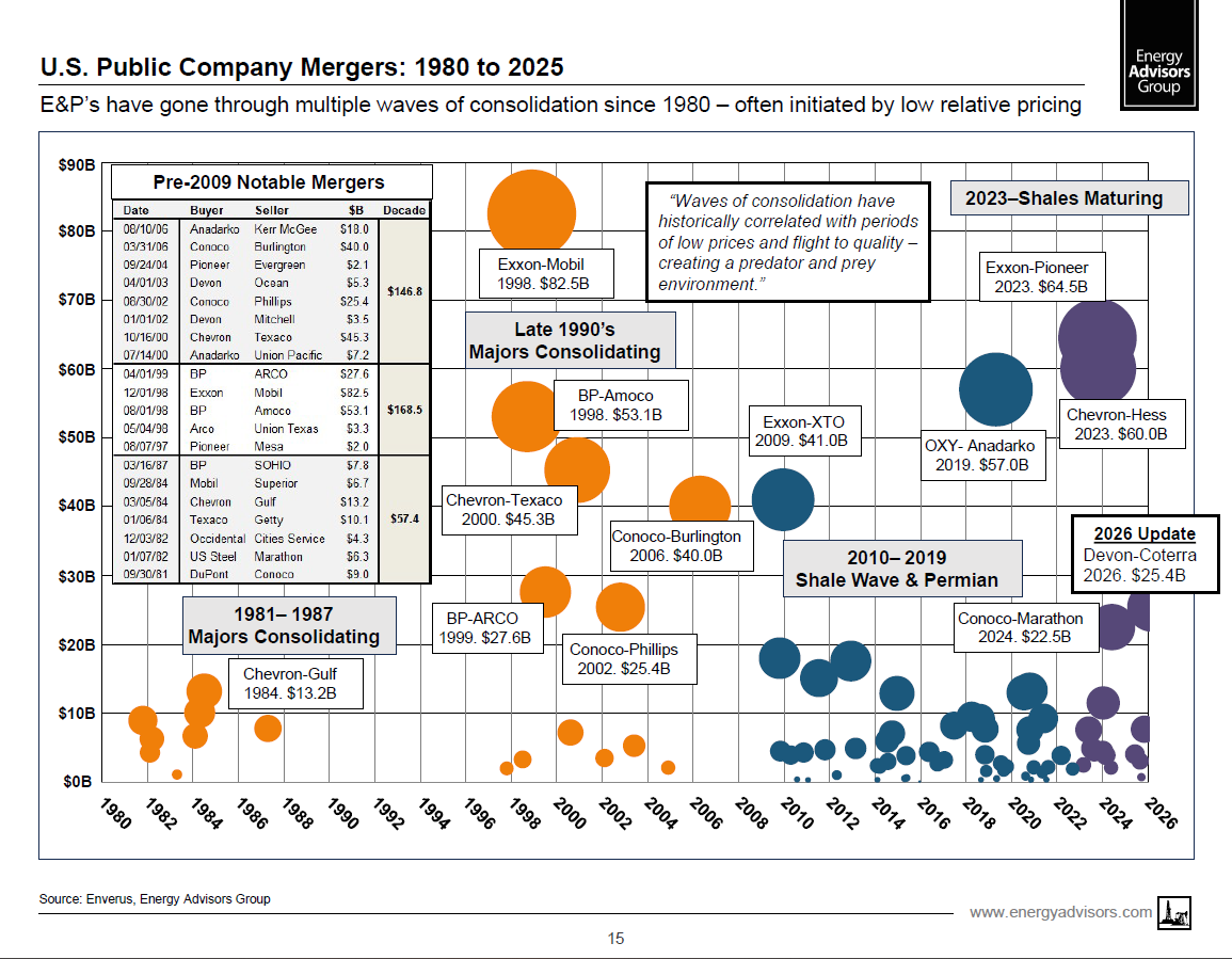 ------- Consolidation. The US oil & gas industry has gone through multiple waves of consolidation dating back to 1980. We've tracked these over time. The current wave began in 2023 and has now seen 15 public E&Ps exit.