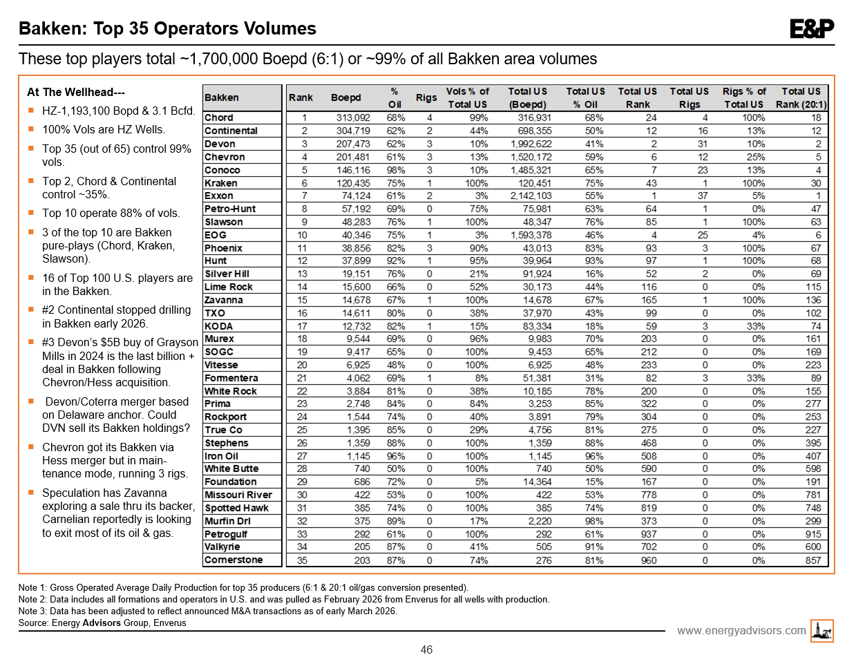 ----- Bakken: A mature Basin. Chord is the top operator and is relying on 3-4 mile laterals to maintain volumes in a low