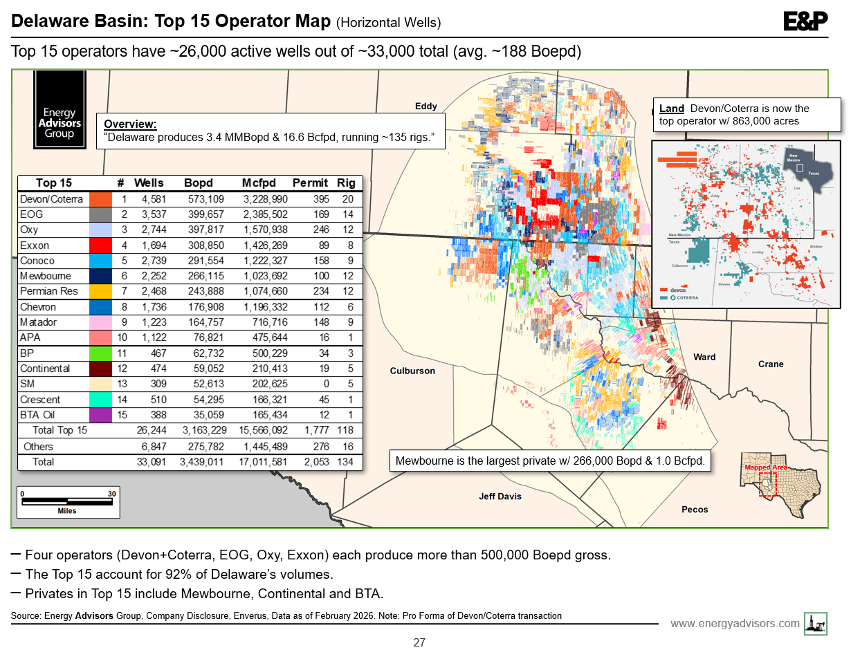 ----- Delaware Basin: Top U.S. oil play with 3.4 MMBopd. Also #2 gas area with 16.6 Bcfpd. More running room than